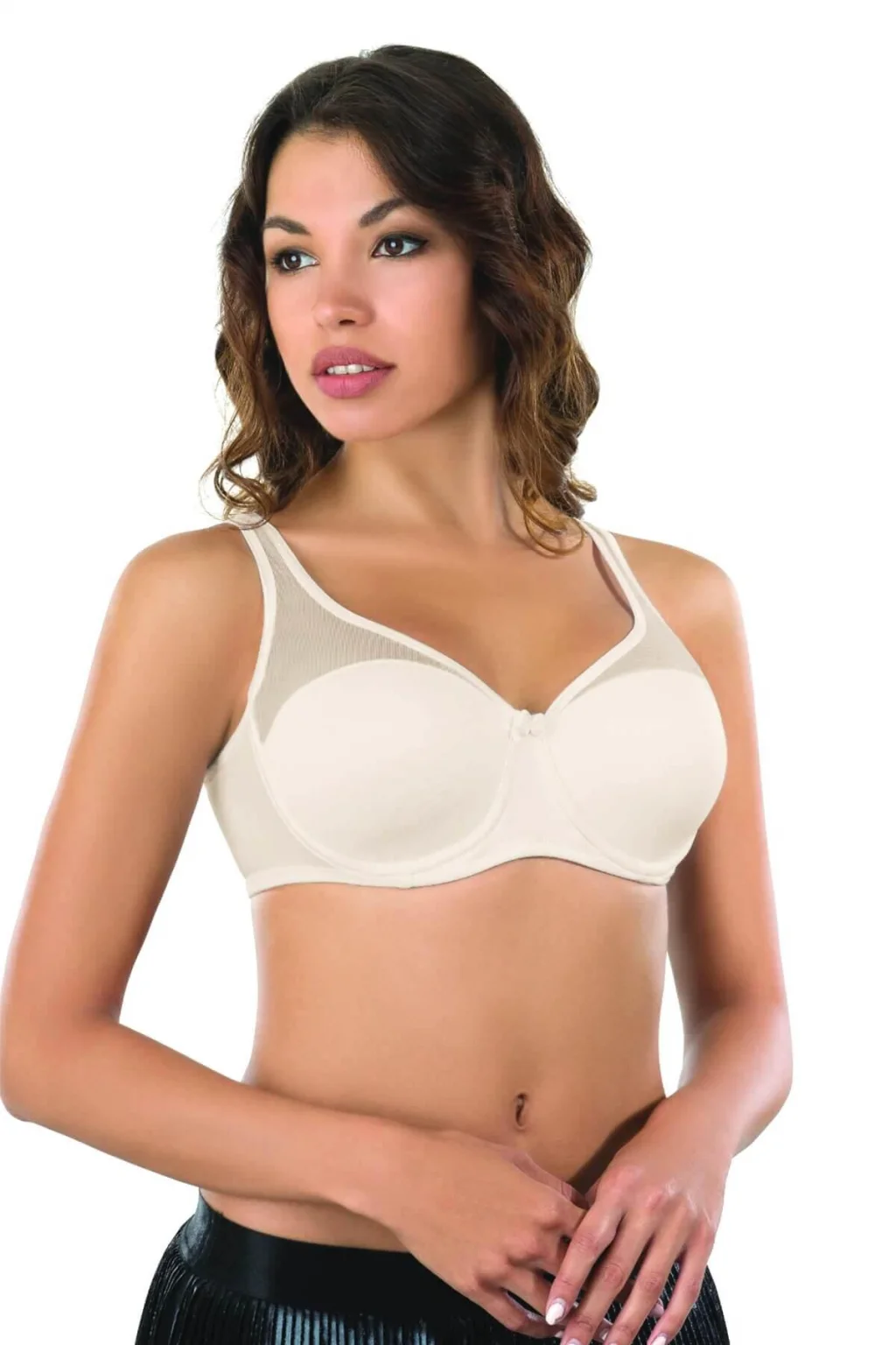 Açık Ten MI Emay 167E modeli, pedli yapısı sayesinde göğüsleri daha dik ve toplu gösterir. Tül detayları ile zarif bir görünüm sunarken, aynı zamanda hafif bir destek sağlar. %100 orijinal yerli üretim olan bu sütyen, kaliteli malzemeleri ile uzun ömürlü bir kullanım sunar.