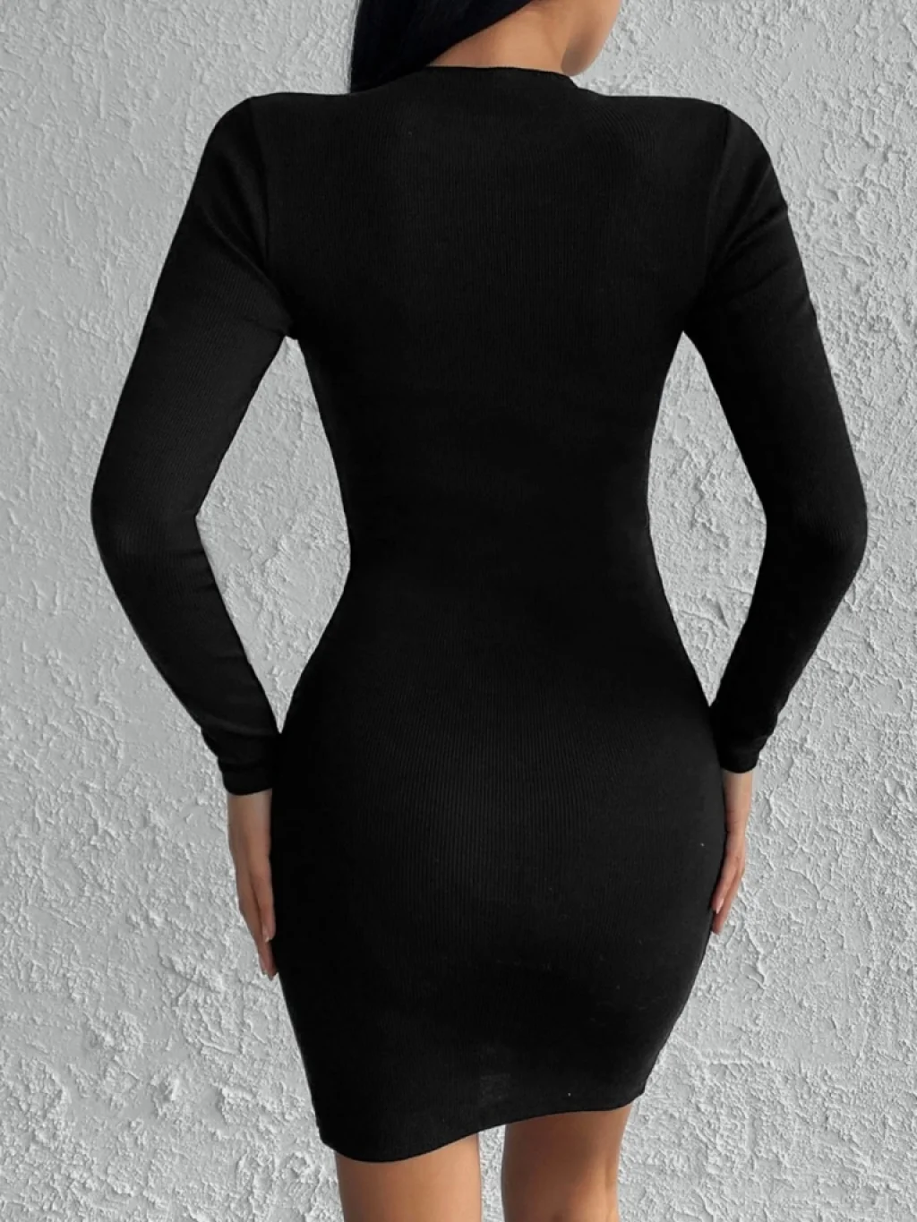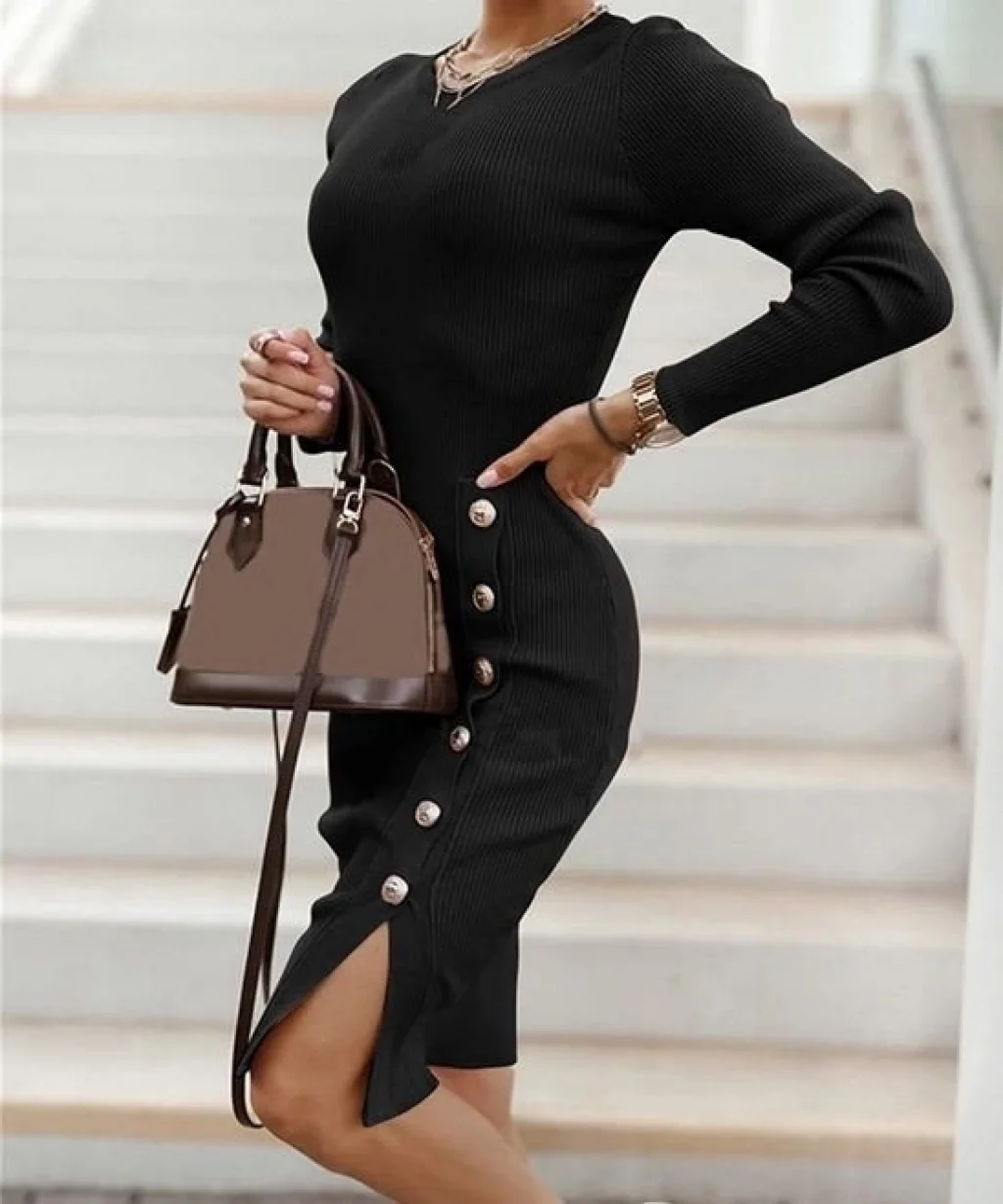Kadın Siyah Uzun Kollu Bisiklet Yaka Yan Yırtmaç Düğme Detay Kısa Kaşkorse Elbise
