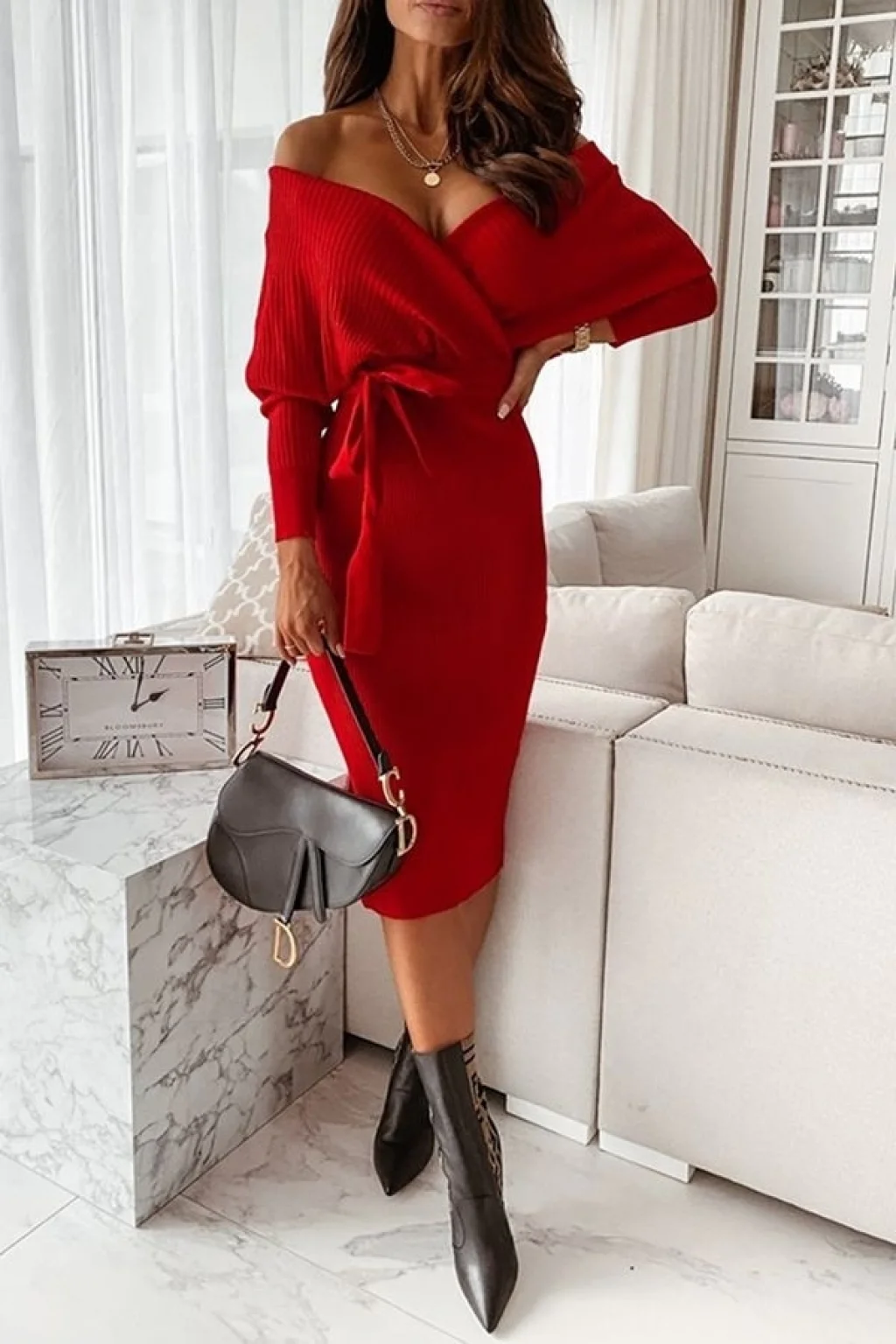 Kadın Uzun Kollu Kruvaze Yaka Bağcık Detay Akrilik Mini Boy Elbise