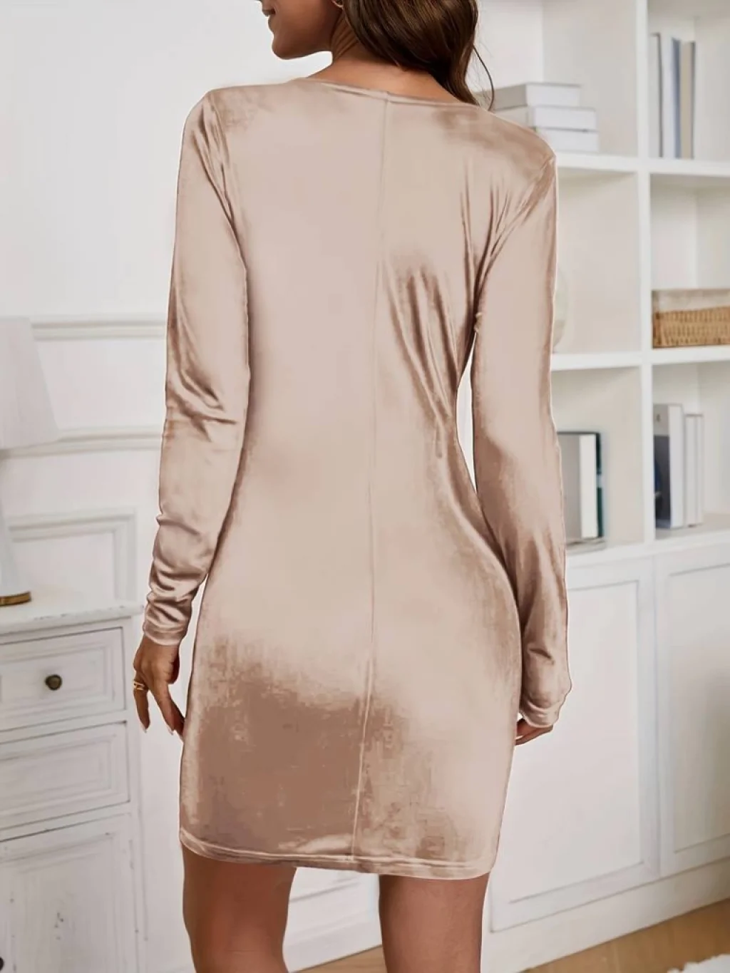 Kadın Uzun Kollu Kruvaze Yaka Kısa Kadife Elbise