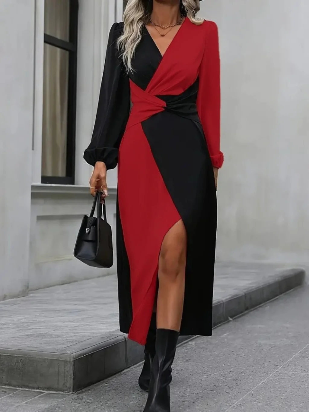Kadın Uzun Kollu Kruvaze Yakalı Belden çapraz Detaylı çift Renkli Midi Ithal Krep Elbise