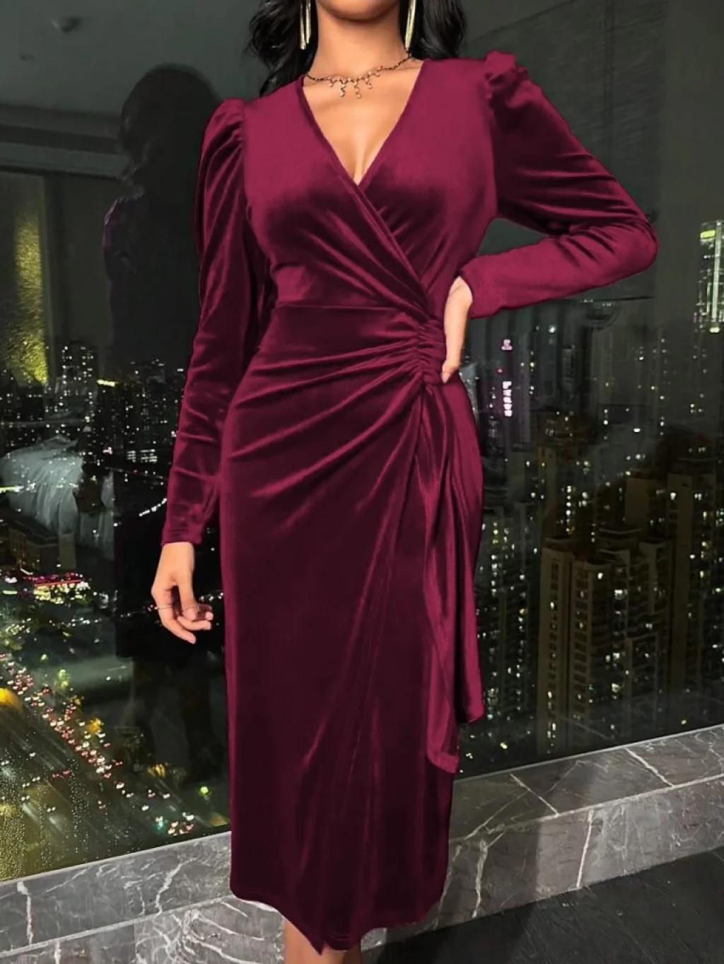 Kadın Uzun Kollu Kruvaze Yakalı Yandan Büzgülü Midi Kadife Elbise