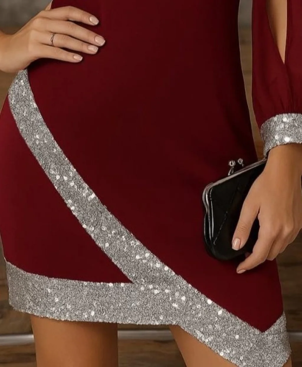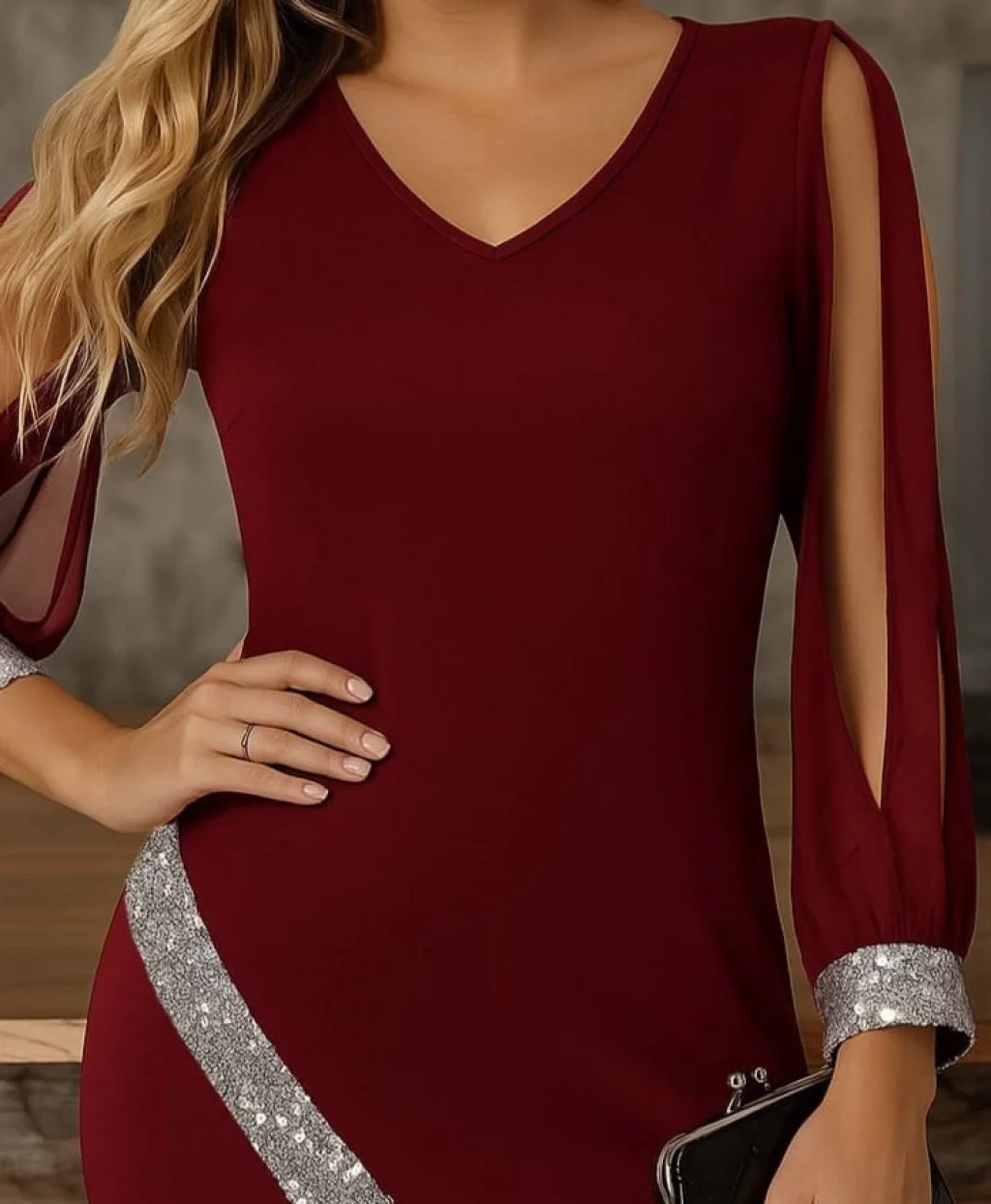 Kadın Uzun Kollu V Yakalı Pulpayetli Ithal Krep Elbise