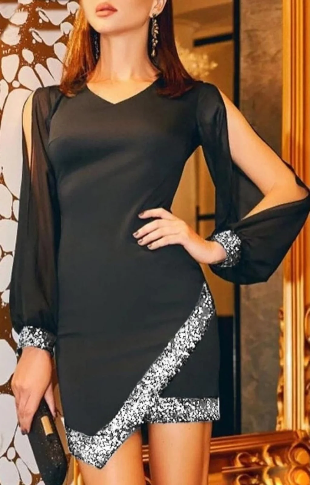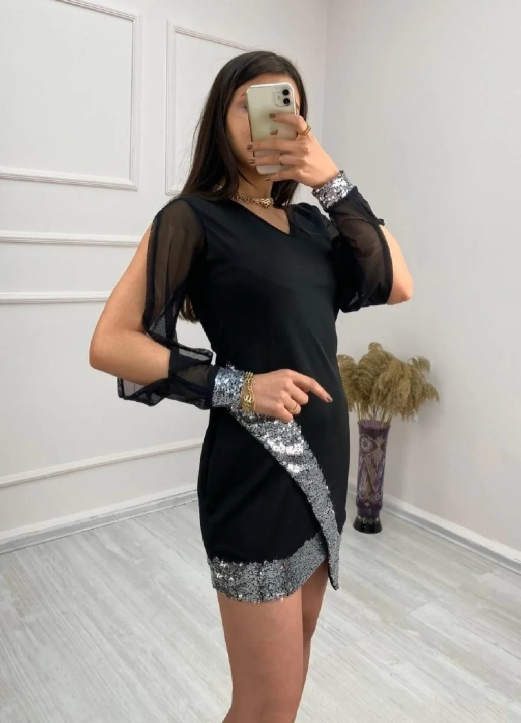 Kadın Uzun Kollu V Yakalı Pulpayetli Ithal Krep Mini Elbise